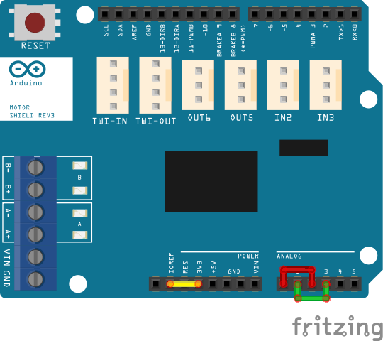 To avoid damaging the ESP32’s analog inputs, alter the IOREF jumper on the bottom of the EX-MotorShield8874 to take power from the 3v3 supply instead of IOREF as described in Power Configuration PCB Jumpers.