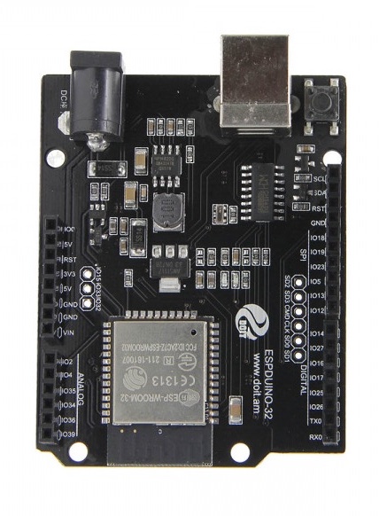 The recommended hardware for now is the WeMos D1 R32, also referred to as the ESPDUINO-32. This consists of an ESP32-WROOM-32 module mounted on a UNO form factor board with UNO R3 style connectors. Pictured here: