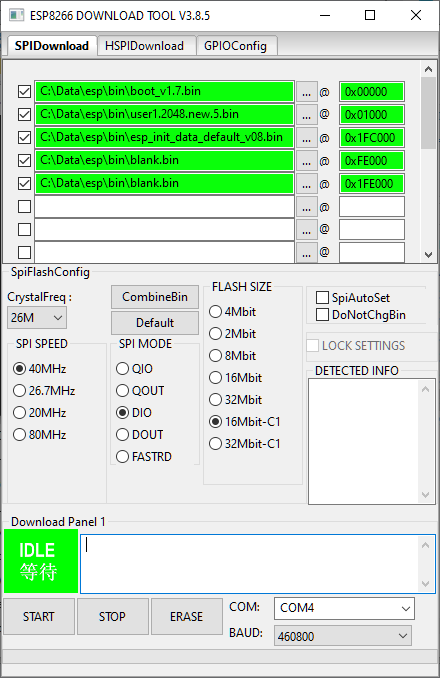 Set the EXACT settings using the radio buttons & baud rate settings: (26M, 40MHz, DIO, 16Mbit-C1, Your COM port selected, and 460800 baud).