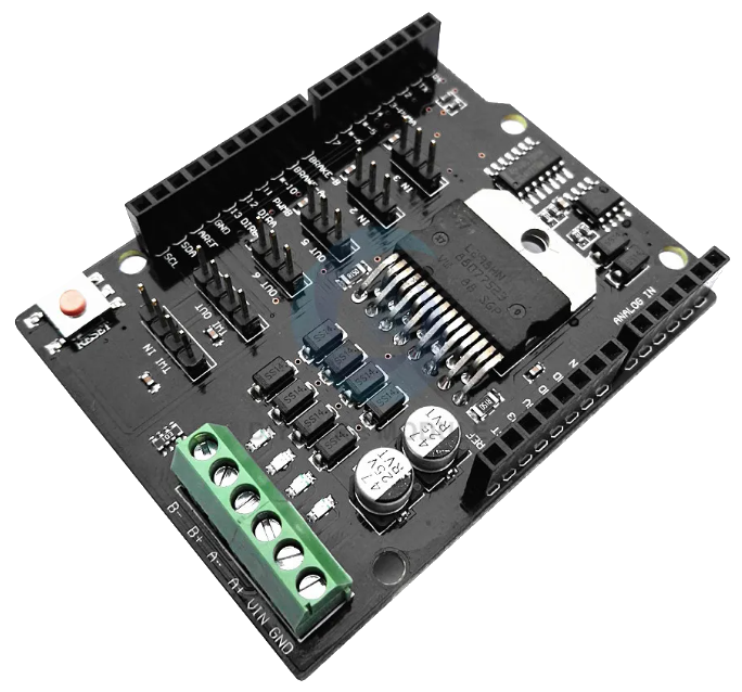 Another similar board to the Arduino motor shield. Supports 2A per channel. This board uses the L298HN, which is the same L298 internally as the Arduino Motor Shield but in a different form factor with a larger heat sink tab. Current sense and other features are identical to the Arduino version.