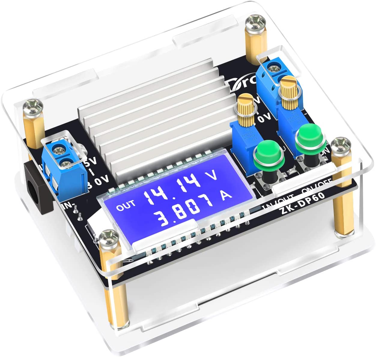 These come in different sizes. Show here is a 2A and a 6A Version. You can look for “60W 6A Adjustable Voltage Regulator with Cooling Fan”, or “DC to DC 5.5V-30V to 0.5V-30V Power Supply Module”. Or just “Buck Boost Voltage Converter”. The bigger unit usually comes with a fan. A model number is a “ZK-DP60”.