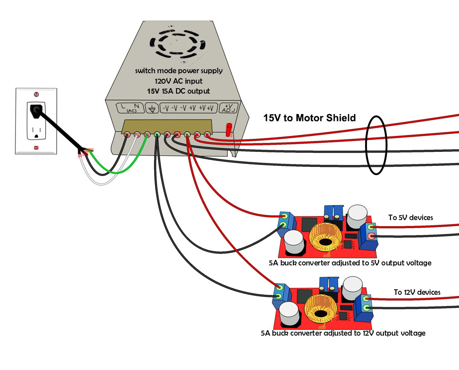 Using this method, you select a power supply that can power the track (or your highest voltage devices) and deliver enough Amps to power everything you will connect to it. This includes the DC-DC downconverters (Buck Converters) that take your higher voltage and reduce it to 5V, 7V, 9V, etc. Note that most buck converters are also boost converters, then can take a lower voltage and raise it to a higher one. We will just cover the first option here.