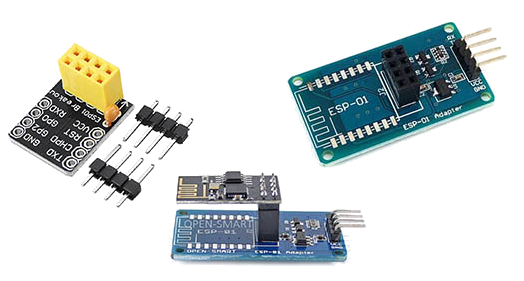 In order to connect both Vcc and CH_PD to the 3.3V output of the Arduino, you can make a “Y” shaped jumper or put the ESP-01s on a small circuit board and wire it that way. Below are little boards you can buy called “ESP-01 Breakout Board” or “ESP-01 Breadboard adapter”. Some even have a voltage regulator so you can use the 5V power from the Mega instead of 3.3V, and “level shifters” to adapt the IO pins from 5V to 3.3. We highly recommend these little boards. In esp-01s-adapters below, the board on the left is just a plain breadboard adapter. The other two boards have the regulator and logic level shifters.