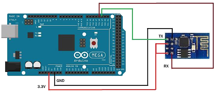 Below is a wiring diagram for connecting the ESP8266 to the Arduino. For clarity, the image does not show the motor board already on top of the Mega, but since the headers connect all the pins together vertically, you can find the same pins on the motor board to get the 3.3V and Gnd to power the ESP8266.