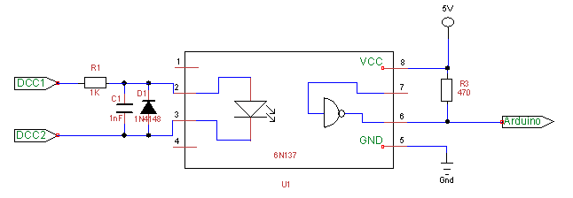 The circuit above represents the minimal number of components to potentially interface the track signal to the microcontroller running your sniffer software. It has been tested and eliminates the issues with many of the circuits available on the web. There should also ideally be a .1µF capacitor across pins 8 and 5 as close to the pins as possible. If you have one, a 1.3k resistor for R1 gives a little better range for track voltages from 10V up to 18V and a LED can be substituted for D1 as a track voltage indicator, though our EX‑DCCInspector sketch uses the pin 13 LED to provide the same function.