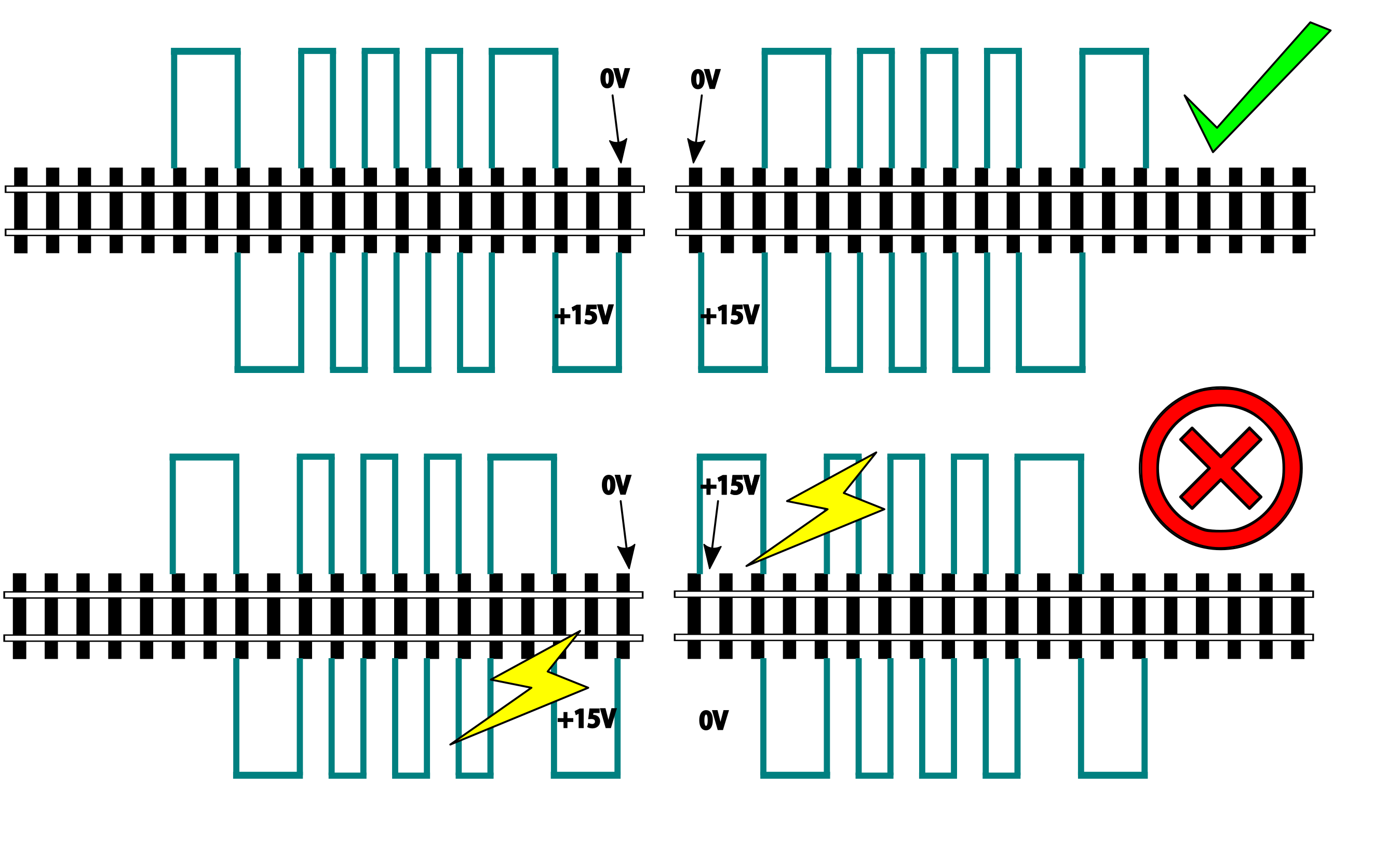 At any given instant, one rail or the other is at our full 12-24 Volts and the other is at zero. If our loco is rolling over the gap from one block or power district to another, we need to make sure that the signal, and therefore voltage, is at the same level on both sides. We call this being “in phase”. So if there is +15V on Rail A of the first block, we need that same +15V on Rail A of the next block. If not, and rail A on block 1 is at 15V and Rail A on block 2 is at 0V, and the metal wheels of our loco temporarily connect those two rails as they roll over them, we have a short circuit. Thus, if the rails of two blocks are out of phase with each other, then they are always at at a the opposite potential (except for a tiny transition period) and will represent a short circuit when crossing from one to the other.