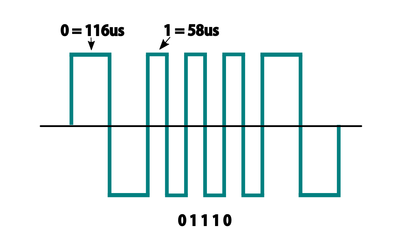 The DCC Signal energises one track with a short voltage pulse (58us) for a “1” and a long one (116us) for a “0”. It then immediately switches and does the same thing on the other track. The “pulse train” looks a bit like this and is the way most people first “see” the DCC Waveform: