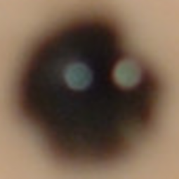 The table below shows a crop of the full resolution pictures of the left eyes of Mr. Yellow Bear (sitting behind Eyoore) and Mr. Pink Squid (sitting in front of Eyoore). In the highlights the effect is most visible. The crop is enlarged three times to give a good picture.
